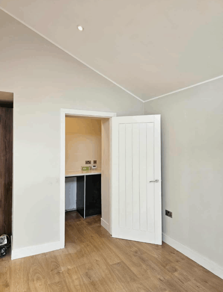 This double garage conversion in Lenzie has been transformed into a spacious and stylish TV room. A false chimney breast